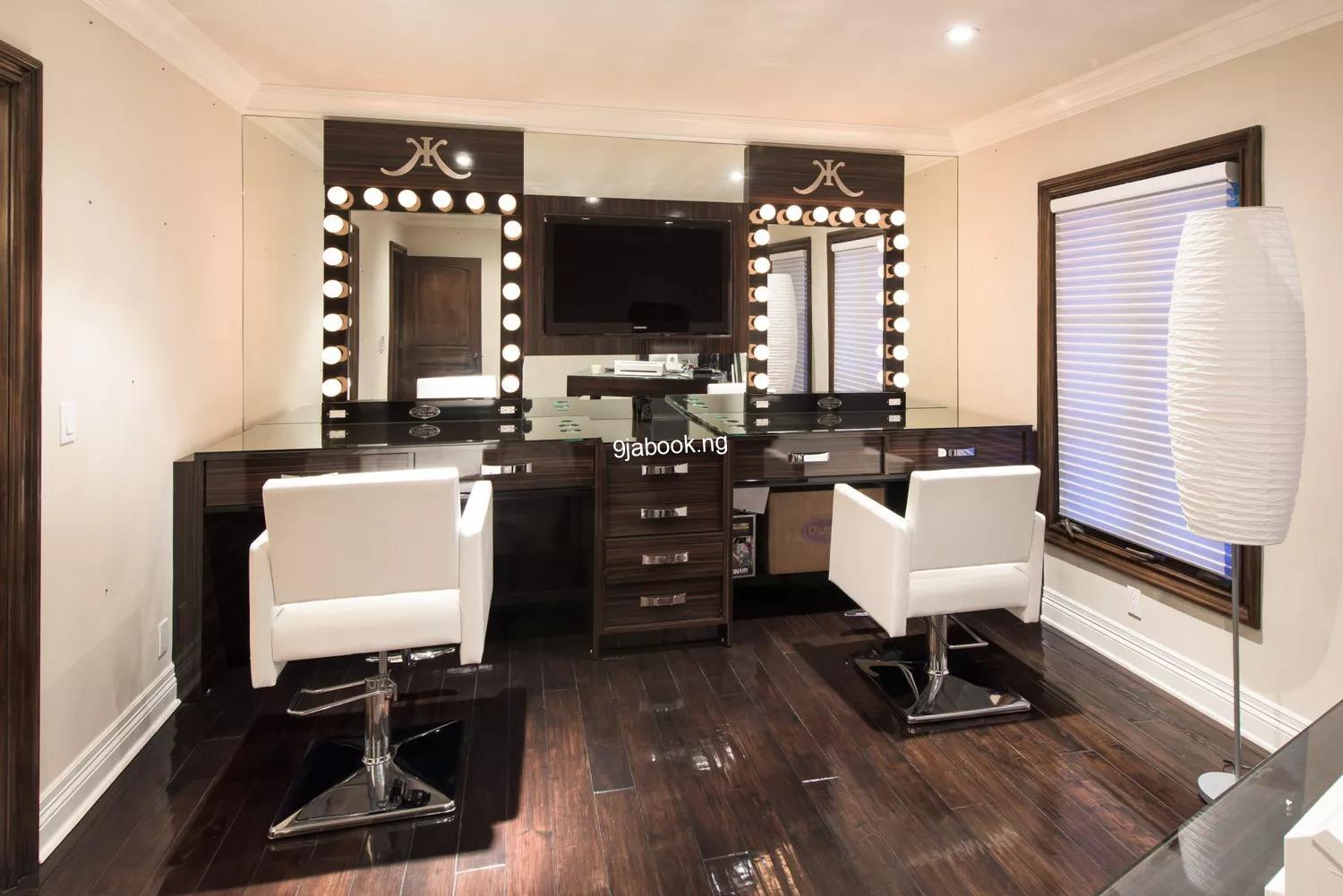 Inside, much of the original furniture chosen by Kardashian West still graces the interiors. The expansive master suite is a highlight, featuring a fireplace, a generously sized walk-in closet, a luxurious soaking tub, a lounge area, and dual vanities. A separate dressing room includes two custom vanities, each bearing her former initials, KK.