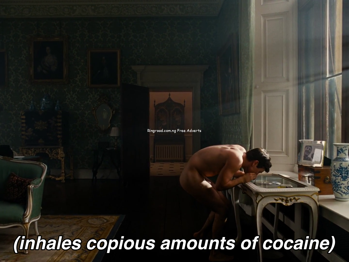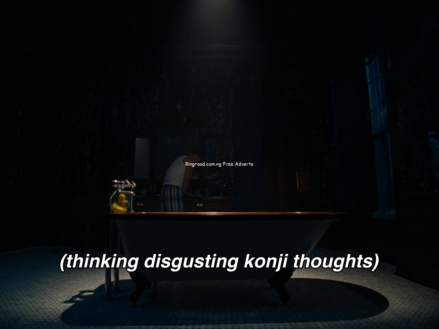 So we’re like forty minutes into the movie at this point, and out of pity, Felix has invited Oliver to spend the summer holiday with him and his family at their estate. Felix and Oliver are staying in adjoining rooms and share a bathroom. One night, Oliver peeps through the bathroom door on his end and finds Felix beating the shit out of his meat in the bathtub.