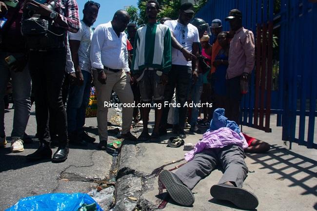 EDITORS NOTE: Graphic content / People look at a body of a person who was shot in Port-Au-Price, Haiti, on April 1, 2024. – The situation in chaos-wracked Haiti is “cataclysmic”, with more than 1,500 people killed by gang violence so far this year and more weapons pouring into the country, the UN said March 28, 2024. (Photo by Clarens SIFFROY / AFP)