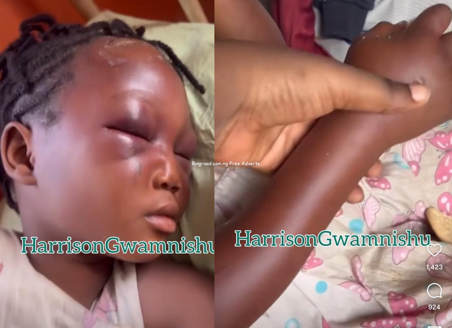 An eight-year-old girl has been left with swollen eyes and hands after she was assaulted by her aunt. Activist, Harrison Gwamnishu, shared a horrific video of the battered minor and stated that she is currently receiving treatment in a hospital in Lagos. He wrote8-year-old child has suffered severe assault by a supposed aunt who picked her up to train her. She resides at Ijaiye, Lagos state and the child has been rescued and currently receiving treatment at D Champions Hospital Lagos. OTHER PEOPLES CHILDREN IN YOUR CARE ARE YOUR CHILDREN. TREAT THEM AS YOURS. If you cant take care of them as yours, take them back.” See more photos of the minor below