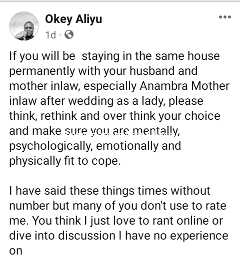 A Nigerian man, Okey Aliyu, has advised women to be mentally, psychologically and emotionally prepared if they plan on living in the same house with their mother-in-law after wedding. Okey gave the advice in a Facebook post on Wednesday, April 24. If you will be staying in the same house permanently with your husband and mother in-law, especially Anambra Mother in-law after wedding as a lady, please think, rethink and over think your choice and make sure you are mentally, psychologically, emotionally and physically fit to cope, he wrote. I have said these things times without number but many of you don’t use to rate me. You think I just love to rant online or dive into discussion I have no experience on. No matter how much love you think your mother in-law has towards you as a lady, the best way to enjoy such peace is to stay far away from her. Some of you young girls thinks it’s the same plate they used in serving you the first day you visited that they will continue to use to serve you. See, If you and your husband will be living together with his mother in the same house, make sure your husband is not the type that dances to every tone of his mother. Make sure he doesn’t rate his mother’s opinions over yours always. You will see shege Then if he now has single sisters who have come of age staying together as well in the same house with their mother and your husband, congratulations to you. Na glorified slave you go be. Shege pro max If you like don’t read to understand and borrow yourself sense. Come here to tell me how good some mother in-laws are. Tell me how I shouldn’t talk about Anambra Mothers Eat shawarma and ice cream this week and throw my advise away. Na You go hear am hot hot when e go set. The post Don’t live in the same house with your mother in-law except you are mentally prepared to handle stress – Nigerian man advises married women appeared first on Swordpress.com.ng.