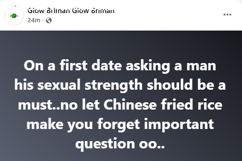 A Nigerian woman, Glory Ekpo, has said that women should ask men their s3xual strength on the first date. On a first date asking a man his s3xual strength should be a must..no let Chinese fried rice make you forget important question oo, she wrote in a Facebook post on Tuesday. The post Asking a man his s3xual strength on a first date should be a must – Nigerian woman tells women appeared first on Time.com.ng.