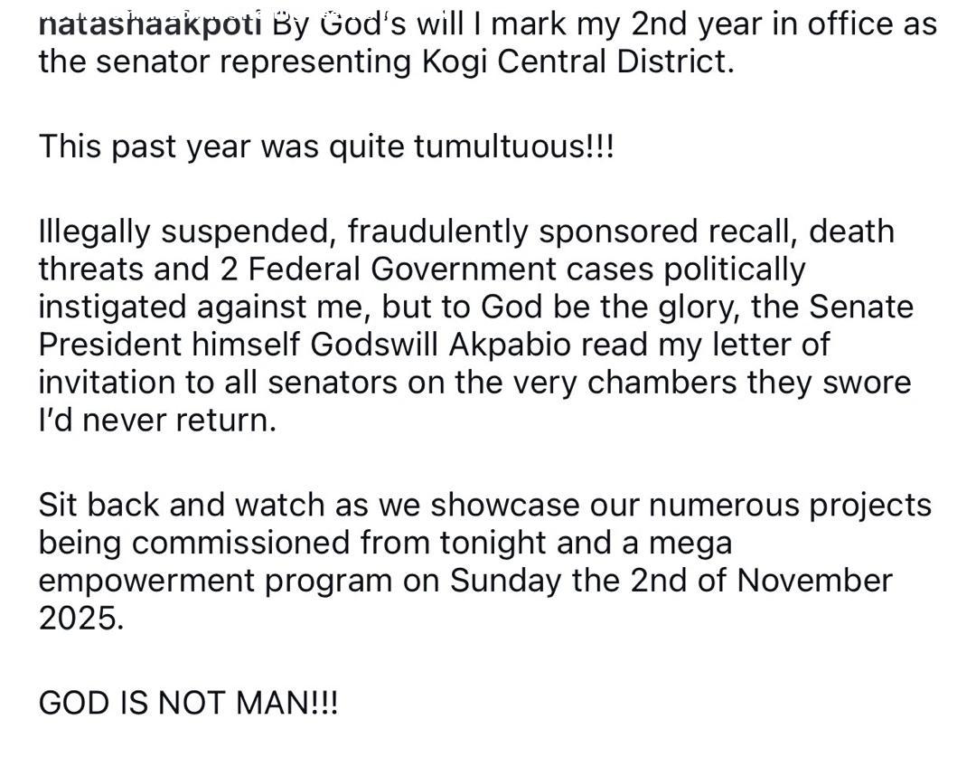 Senator Natasha Akpoti-Uduaghan took to social media last night to taunt her enemies hours after Senate President, Godswill Akpabio, read her letter inviting him and other Senators to her 2nd year anniversary in office celebration. During plenary on Thursday, October 30, Akpabio read a letter from Senator Natasha announcing plans for the celebration of her 2nd year in office as a Senator. Many Nigerians were left surprised by Akpabio’s action given that both of them have been at loggerheads and are even in court following the altercation they had with regards sitting arrangements in February. Some even believed that peace had been restored between Akpabio and the Senator. However, hours later, Senator Natasha took to her Instagram page to share a video of Akpabio reading her letter of invitation and pointed out that the senate president was reading the letter in the same chambers he swore she would never return to. She also responded to one of her followers who mentioned that she should not remove her leg” from the neck of her enemies, an expression in local parlance which means she should continue to deal with her detractors. The post Natasha Akpoti taunts her enemies hours after Akpabio read her letter inviting him and other Senators to her 2nd year anniversary in office celebration appeared first on Time.com.ng.