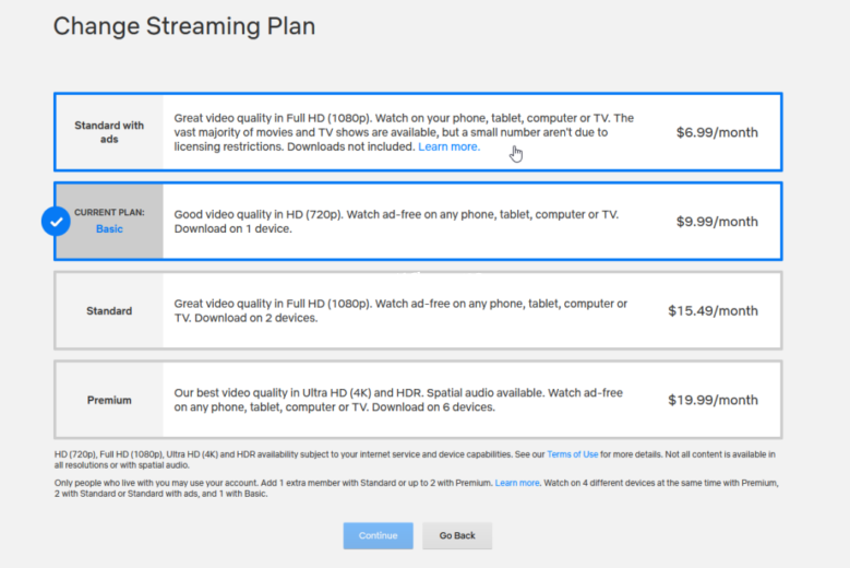 Standard with ads ($6.99/mo.) gives you Full HD 1080p video resolution and the ability to watch Netflix on two devices simultaneously, as long as both are in the same household.