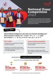 This year, Senior Secondary School students in Nigeria will be expected to write on the essay topic: “Will Artificial Intelligence (AI) Surpass Human Intelligence? How Can Students Ensure AI Enhances Their Learning Through Research?,” and are to scan and upload their handwritten essays to https://www.ubagroup.com/national-essay-competition/ on or before October 20th, 2023.