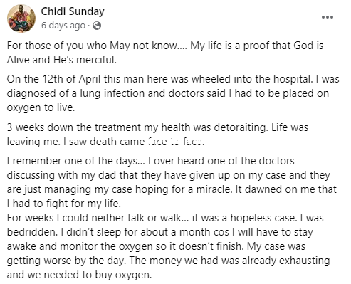 Read his story below For those of you who May not know. My life is a proof that God is Alive and Hes merciful.On the 12th of April this man here was wheeled into the hospital. I was diagnosed of a lung infection and doctors said I had to be placed on oxygen to live.3 weeks down the treatment my health was deteriorating. Life was leaving me. I saw death came face to face.I remember one of the days I over heard one of the doctors discussing with my dad that they have given up on my case and they are just managing my case hoping for a miracle. It dawned on me that I had to fight for my life.For weeks I could neither talk or walk it was a hopeless case. I was bedridden. I didnt sleep for about a month cos I will have to stay awake and monitor the oxygen so it doesnt finish. My case was getting worse by the day. The money we had was already exhausting and we needed to buy oxygen.I woke up one morning and then the Holy Spirit said : take a picture of you and post on Facebook. Naturally I wouldnt have. I obeyed. He said reach out to Bmp Anthonent and Chukwudi Somack Mmesoma. Now this was the first miracle!People started responding. I literally saw how people gave and gave and gave. We moved from 6 oxygen per day to about 10. Each of this oxygen cost for 18,000. In a day we were buying drugs over 40-50kIt got to a point it was looking as if there was no improvement after all the money spent.To shaken my faith people were dieing like rats in my ward. I lost count of death that took place at the hospital. 80% died on oxygen. Regardless, I kept declaring I wont die! Not now. Thank God for Dominion City Lagos who stood with me in prayers and arms. Infact my account was displayed on the screen . Church kept giving, members kept giving. There was literally nobody who wasnt aware of my case.When all hope was lost!!!! Against all oddsThat faithful morning the doctor walked in and said Chidi youre going home. I will discharge you today.The hospital erupted!! You need to see the shout. Nobody believed . He said pull of the oxygen. I did!! Stayed for an 1hr nothing happened. Poir to this time, any second without oxygen is death.But mehn!!!!!!!Chidi has been breathing for the past one month.Guess what? My recovery process is supposed to take extra months staying at home. But were all seeing what God is doing. The speed at which i Im recuperating is humbly!This is a tastement that God is FAITHFUL”Chidi who recently turned 29, shared new photos showing how much he has recovered.Dis one no be photoshop oooo.This are life pictures of what God can do.One of the promises I told God at my death state was if I get to ever live again I will sound His faithfulness to ends of the earth.Incase youre getting tired seeing my pictures.Hmmmm. Now na good morning. I never even startNa only me know wetin my eye see”