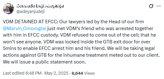Lawyer, Deji Adeyanju, has given an update on the arrest of social critic, Martins Otse popularly known as Very Dark Man. In a post shared on his X handle, Adeyanju disclosed that VDM is currently being detained by the Economic and Financial Crimes Commission, EFCC. He mentioned that his lawyers have located where VDM is being held but that the activist has refused to see anyone. VDM DETAINED AT EFCC: Our lawyers led by the Head of our firm @Marvin_Omorogbe just met VDMs friend who was arrested together with him in EFCC custody. VDM refused to come out of the cell; that he wont see anyone. VDM was locked inside the GTB exit door for over 5mins to enable EFCC arrest him and his friend. We will be taking legal actions against GTB for the inhumane treatment meted out to our client. We will issue a public statement soon.” The post VDM is being detained by EFCC – Lawyer, Deji Adeyanju, gives an update appeared first on searchng.ng by Dotiifi Digital www.dotifi.com.