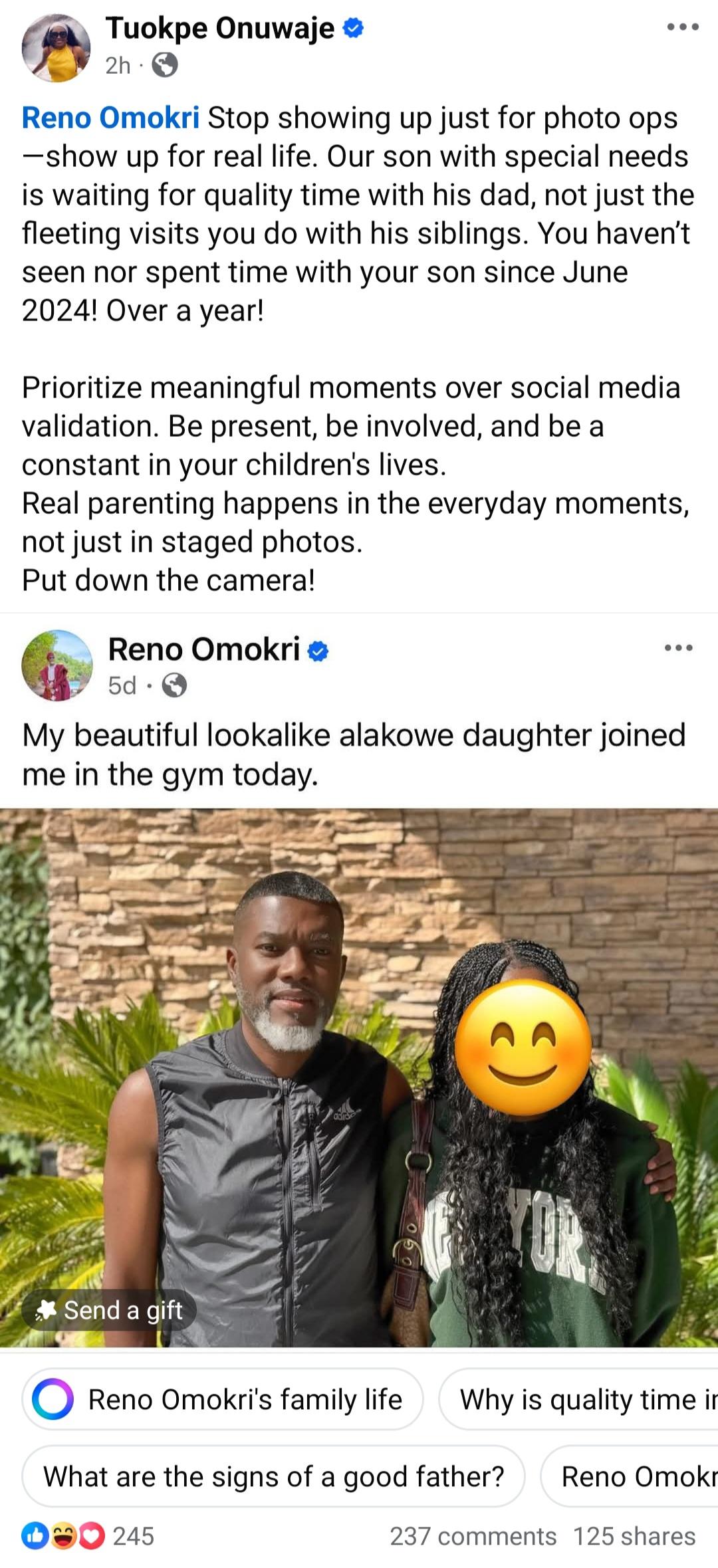 Reno Omokri has been called out by his ex-wife after he shared a photo he took with their daughter. Reno, the ex-media aide to former President Goodluck Jonathan, was married to Tuokpe Onuwaje and they have three children together. Reno recently shared a photo he took with the only daughter he shares with Tuokpe. “My beautiful lookalike alakowe daughter joined me in the gym today,” Reno captioned the photo. Today, Tuokpe took to Facebook to call out Reno for the post. She wrote: “Reno Omokri Stop showing up just for photo opsshow up for real life. “Our son with special needs is waiting for quality time with his dad, not just the fleeting visits you do with his siblings. You havent seen nor spent time with your son since June 2024! Over a year! “Prioritize meaningful moments over social media validation. Be present, be involved, and be a constant in your children’s lives. “Real parenting happens in the everyday moments, not just in staged photos. Put down the camera!” The post “Real parenting happens in the everyday moments” Reno Omokri’s ex-wife accuses him of neglecting their son with special needs after he posed with their daughter appeared first on Time.com.ng.