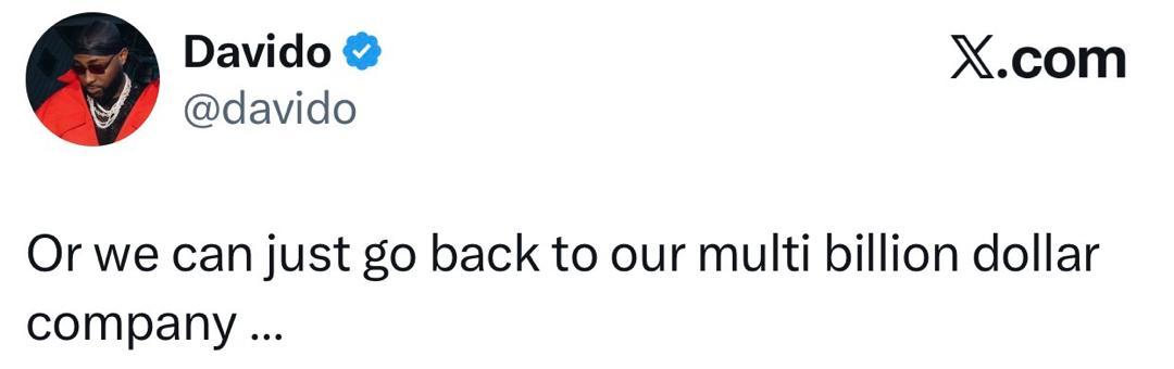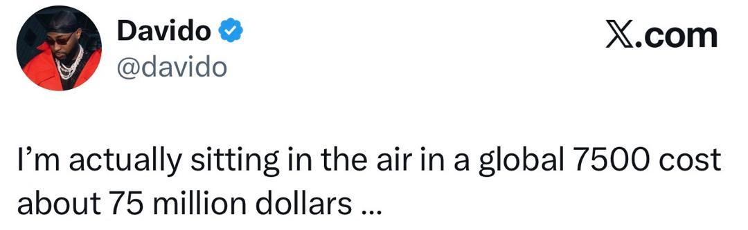 Singer David Adeleke aka Davido some hours ago, reminded some X trolls of his familys networth. It all started when a troll mocked his Uncle, Governor Ademola Adeleke’s recent defection to Accord Party and suggested that if the governor gets defeated in the state governorship election scheduled to hold August 8, 2026, Davido will be forced to compose the APC campaign song for 2027. Davido spotted the comment and responded, implying that if his Uncle loses, he will just return to their family multi-billion dollar company. Another X user who wasnt pleased with Davido’s response, asked the singer to go and sit down for ground jor” SecDavido’s response below The post ”Im sitting in a global 7500 that costs about $75 million – Davido clapsback at troll who asked him to ”go sit down” appeared first on Time.com.ng.